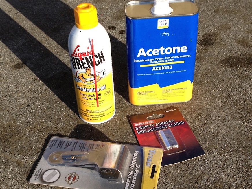 First, more tools. Liquid wrench, acetone, a scraper and some spare razor blades. Yes, I know by now that's not the right scraper- the guys at the automotive store were FC about this stuff, so I grabbed that because hey, it's cheap and I need one anyhow.