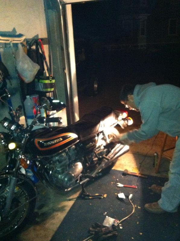 Preparations were made in earnest the night before...here is Alex (Crush) fitting his new tires/wheels onto his trusty 550 by torch light