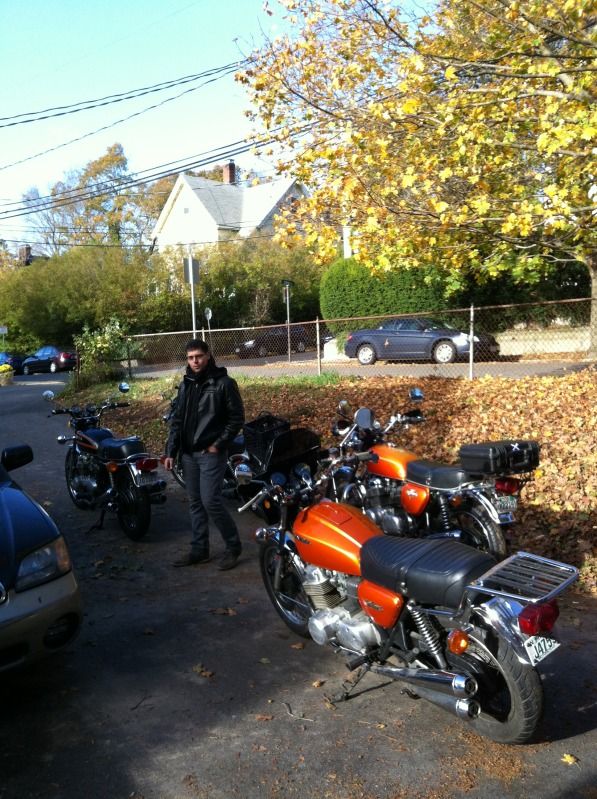 We waited with Alex until the trailer could arrive...taking turns on each others bikes...I found out that Treeves blue CB750 has a very fierce rear brake and proved the point by unintentionally leaving a long black skid mark as I raced up to an all too fast approaching stop sign. Meanwhile Alex was trying to bribe Treeve for the keys to his 750...