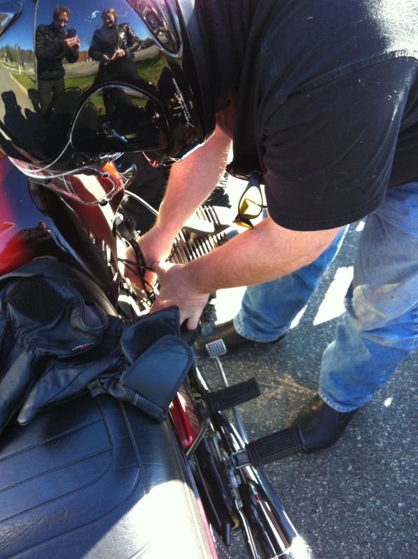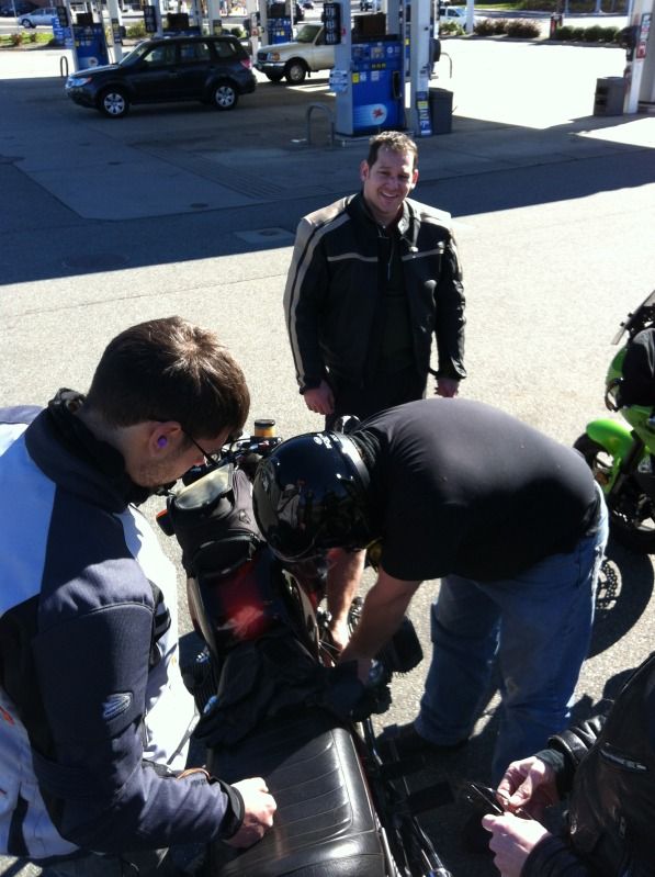 Next up we met with Ben (Azuredesign) on his Beemer further down the Bay Road who had earlier texted me he was suffering from carb issues. We found him looking forlorn at the side of the road so we all decamped to the nearest gas station were he made attempts to fix his leaking fuel line using zip ties....it was a dangerous job so he had to wear his helmet...