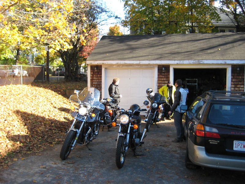 And the next day brought cold temps (36F starting). We waited as Anders donned the yellow banana suit to take him back to NH (his bike would last as long as the I-95 on-ramp where it would fail with all loss of power -bad wire in the harness - he "phoned a friend" and John came down from NH with some wire and tools and he fixed it roadside and was on his way).