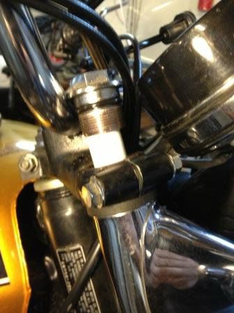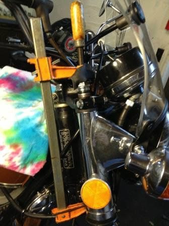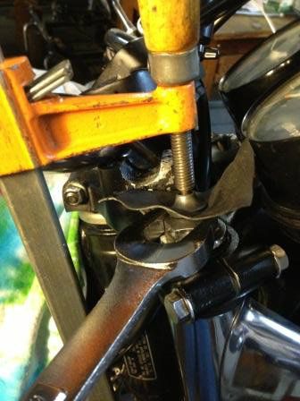 That's a woodworking clamp, with a square of old inner tube rubber under the clamp's foot to keep it from slipping off the domed fork cap. I turned the clamp down slowly, keeping the foot centered, until the cap's threads met the tube's threads.