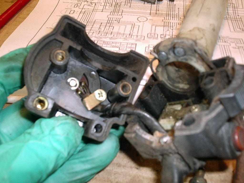 Recently I've been going through the wonderfully enjoyable experience of completely cleaning out, resoldering, replacing and reassembling the teeny, tiny parts inside of the handlebar controls for my 1974 CB550. I'm usually pretty careful and shoot photos of the overall part before I take it apart, but to my horror my digital camera stopped working, and corrupted most of the photos on it. I managed to salvage only one useful photo of the controls.