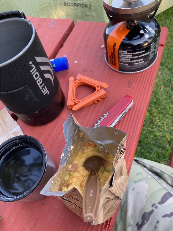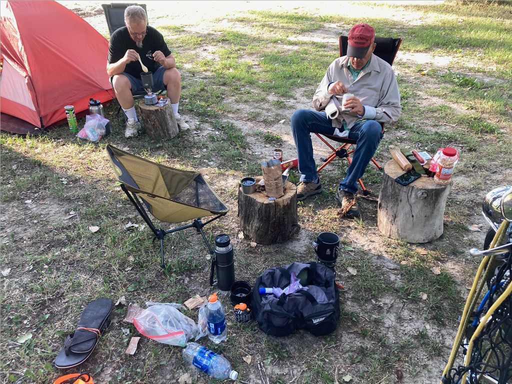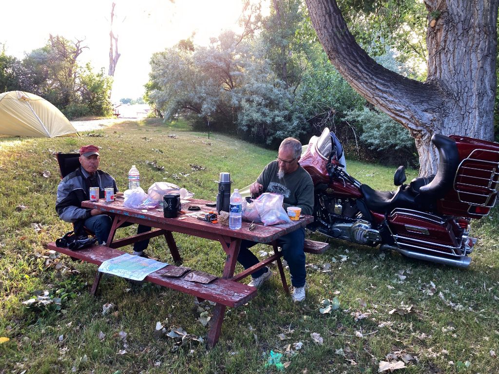 County fairgrounds in Roundup, MT has a fine campground.  No picnic table, but there were some handy rounds laying around to eat off of -