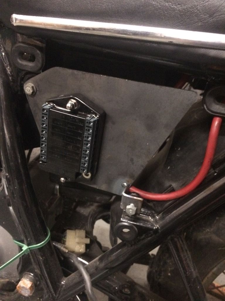 We'll also be using the stock bracket off the starter solenoid and mount that solenoid to the right of the M Unit. The R/R will attach to the back side of this panel (towards the rear of the bike). Space is really limited under that cover but I hope this works out.