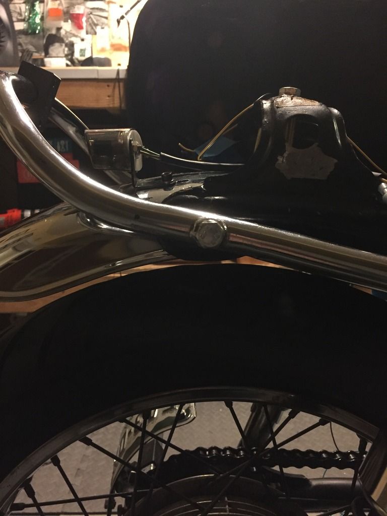 Ok everyone I need some help/ideas. While I'm waiting for more sleeving and wire to get here I decided to revisit where the rear turn signals will mount. Originally I wanted them to mount on the grab bar about 1 1/4" back from the mounting point to where the grab bar mounts to the frame. The plan was going to be to run the wires internally forward, out a small hole and then along the frame. I was going to drill a larger hole on the inside of the grab bar so that the mounting nut would be hidden inside but the hole size required to get the nut inside the grab bar is too big and will weaken the grab bar too much. The threads on the turn signal are not long enough to go through the bar either.