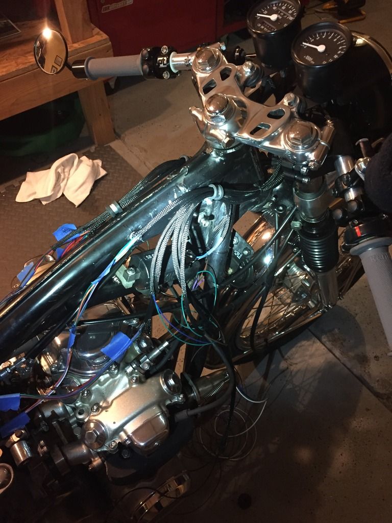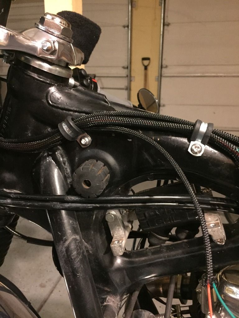 And finally, I thought it would be a good idea to hook things up to the M Unit and power it up and see if everything worked. Horn, headlight (hi/lo), start, and both front turns worked fine. This was very exciting. The only issue was that the M Lock wouldn't work. There's only three wires for that and the other grounds grouped with its ground were fine (switches worked) so I didn't think that was the issue. Brown was straight to the M Unit and red went to battery POS. So I took apart two looms so I could see all three wires and the soldered joints. I removed the heat shrink from each wire and, while there was a little crispy spot on the brown (which could have happened while heating the shrink) they seemed fine. I cut each wire so everything was clean, used jumper wires and ran red to battery POS, green to battery NEG, and brown back to the M Unit LOCK. Nothing. This is strange because Cal walked me through how to power the M Unit and M Lock on the bench not long after getting them and we programmed the fob and they both worked perfectly. Not sure what the issue is now.