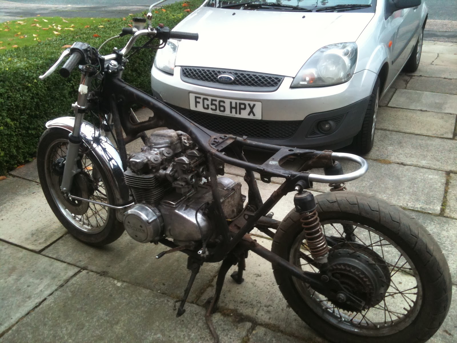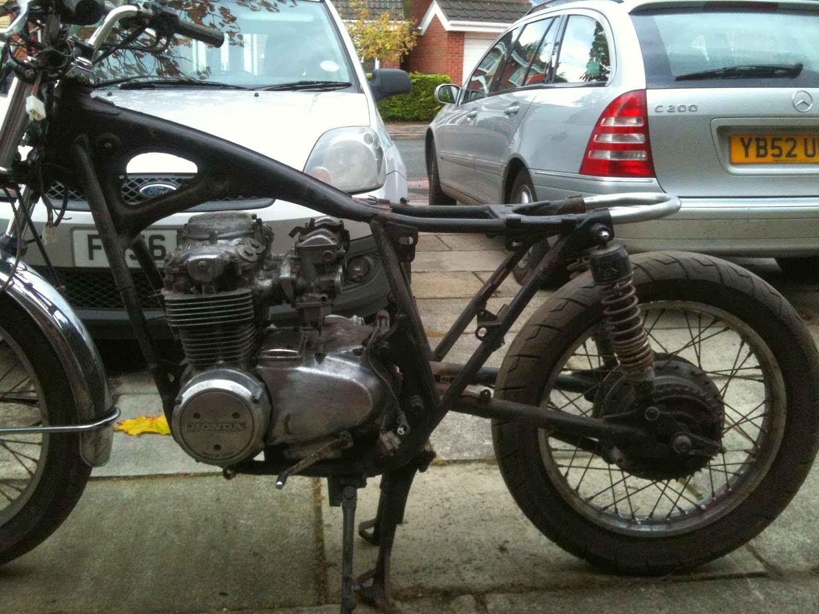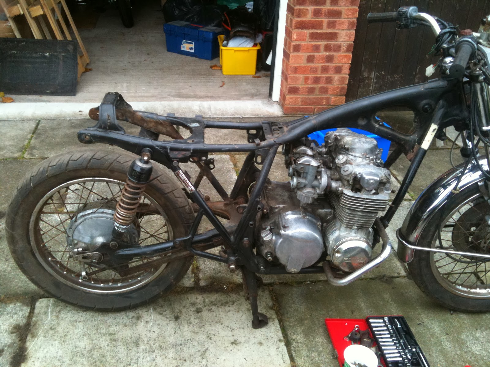 looks like the motor will be just a freshen up & paint, then on with the strip down, broke it down to a rolling chassis & cut the rear off the frame to fit the café hoop