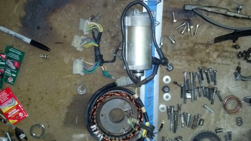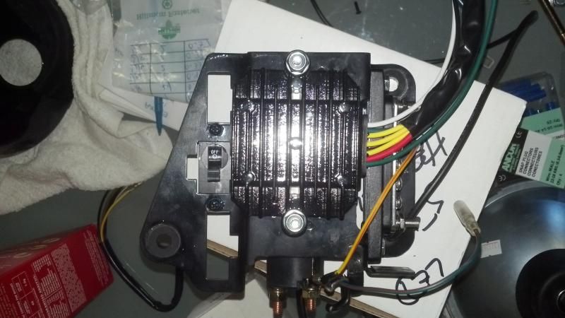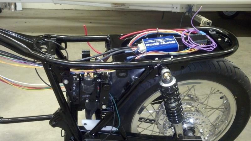 Wiring is in full swing.  Except for the starter safety unit (which Mr. Postman delivered this morning), I have everything I need mounted and wired on the left side electrics plate.  I used an OEM plate, blasted it, then cut off all mounts, etc which I do not need.  It was much easier than trying to fab up a new plate.  Now all I need to do is wire up the brake switches (not using a clutch switch), the neutral switch, connect the Dyna to the stator once the engine is back in the bike, and wire up the m-unit input wires to the 2 handlebar m-switches (5 push buttons total).  I also have a new Yuasa sealed battery with great cranking amperage (only slightly taller by 1/4" than OEM), and stator/field coil rewired by Rick's, rebuilt starter motor, and 2 new starter solenoids - also by Rick's.  Getting close - its making me crazy.