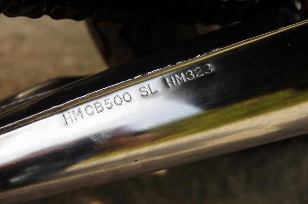 http://forums.sohc4.net/index.php?topic=119831.msg1356926#msg1356926Here's my question: I seem to remember that where now my exhausts have the number 323 on them, the original ones had a different number (could it have been 374?). I am just not sure. Now the same type exhausts were put on the 1976 550K2. Could any of you that has the original 4-4 exhausts on his 1976 CB500/550K2 have a look what number is on the mufflers?
