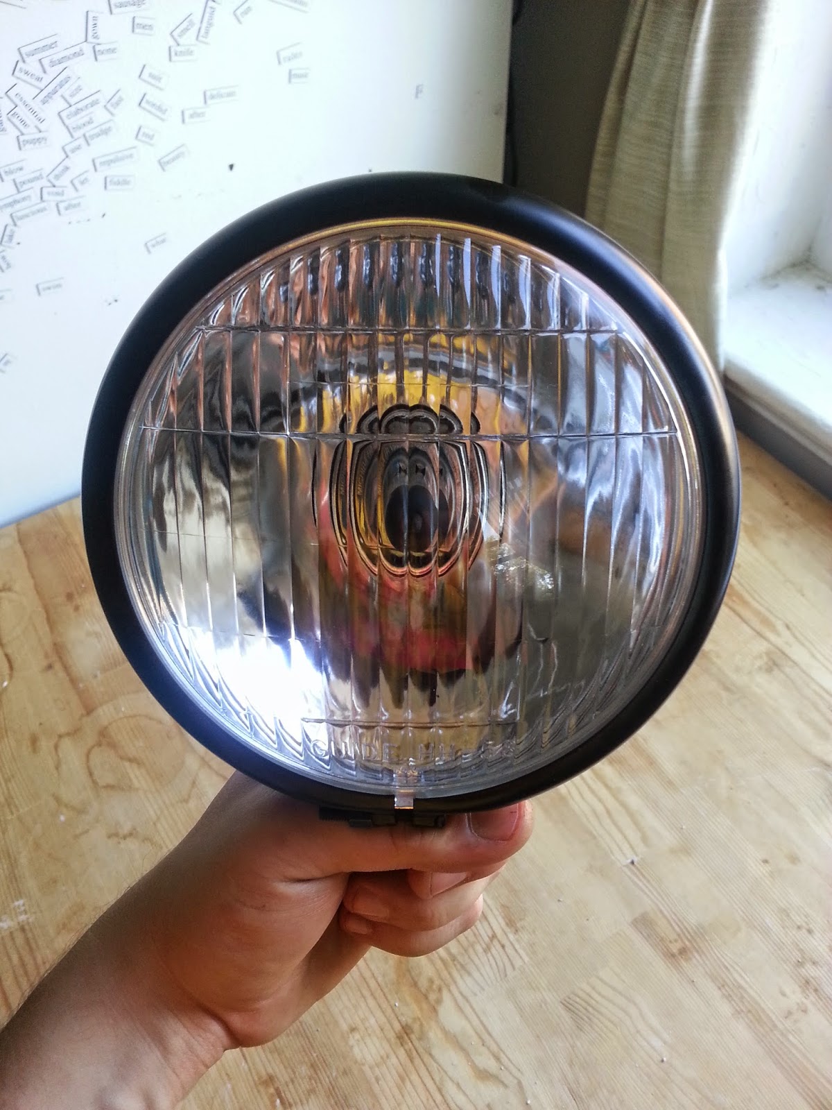 I picked up a new headlight and it's a little smaller than stock. I'm going for a little cleaner look up front. It's also a bottom mount headlight so I'm fabbing up a bracket for it this weekend so that it'll mount to the lower fork bolts.