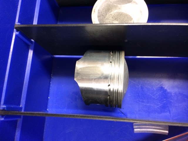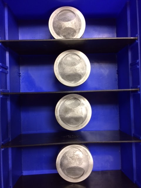 Today I tore down the top end of the Honda to see how the Benelli cam chain tensioner had held up.  It was good news.  The wearing surface has minimal wear and is good for another season of racing.  Also found the pistons and head to be looking good.  The squish area of the pistons is clean and I am expecting all to be in good order after the carbon is soda blasted.