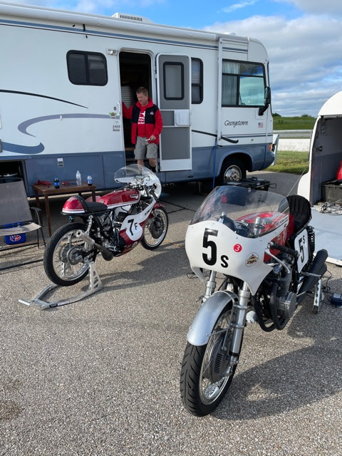 Next up was New Jersey Motorsports with AHRMA. As a bonus Brent Waller, Mike Rieck and George Schuld (helping Matt Esterline) were also attending. The trip did not get off to a good start. Wednesday afternoon I tried to start my van to hook it up to the trailer and it would not stay running! It cranked, fired, and then died. After about 6 tries I called the towing service and had it taken to the repair shop. They did not have any quick fix suggestions and I left it with them. My brother was planning to attend , but not race. He had returned to the doctor as his leg was continuing to give him trouble. New x-rays showed the leg was indeed broken, so no racing for him. Fortunately he had driven his mini van out and my bike fit with one inch to spare. So off to NJMP we went.