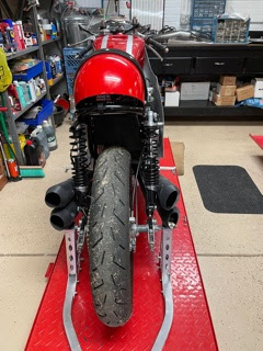 When I last posted I was hoping to make the AHRMA Daytona race in January. The injury to my finger (torn tendon) took much longer to heal than anticipated and Daytona was a no go. Over the winter I decided it was time to upgrade my front brake. The Grimeca I was using has been less than adequate, fading after a couple heavy braking corners and causing me to give away too much ground. Went with a 250mm Fontana which I bought from John Clarjis. The Fontana is a magnesium alloy versus the aluminum Grimeca. So the Fontana is both bigger and two pounds lighter.