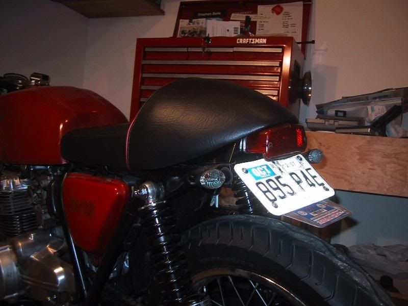 Really like the looks of the Norton fender, but unfortunately I still have to mount a license plate, brake light and inspection sticker out back. I'm trying to make it all look clean and integrated. Version 1 was hacked and bent out of some scrap sheet metal this weekend. Mounted it up and then thought of a better idea, so I'm working on version 2.0 at the moment. It's like I'm running my own little Microsoft out of the garage. I'll post some pictures when I'm done beta testing.