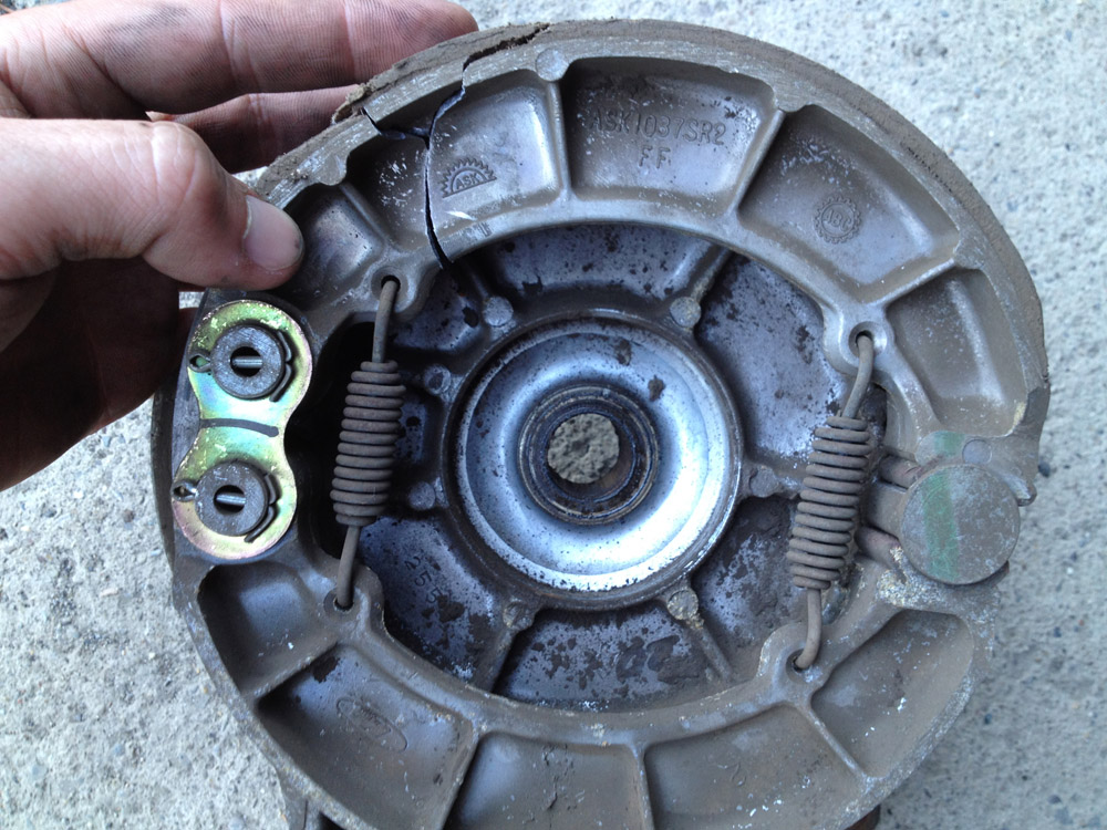Otherwise, new shoes are cheap insurance. I've got enough to worry about as far as "cagers" trying to run me over without flinging myself down on the asphalt as a result of a failed brake shoe locking up the rear wheel. Sure, you could use them, there is indeed plenty of pad left on the shoe, and they might work well until they are worn to their service limit without any issues, and you could replace them then. I've used old shoes without issue (back when I was younger... and invincible), but I've also had old shoes sitting on the shelf that had the linings fall off. Ultimately it's your hide and your decision to make.