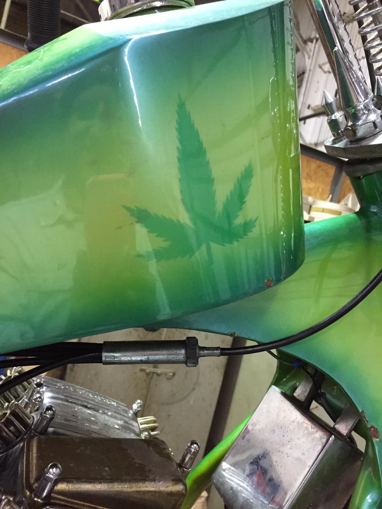 This is on the rear fender. Paint all over is nice with some blemishes and patina and some scrapes, but in pretty great shape overall with the whole "weed" theme.