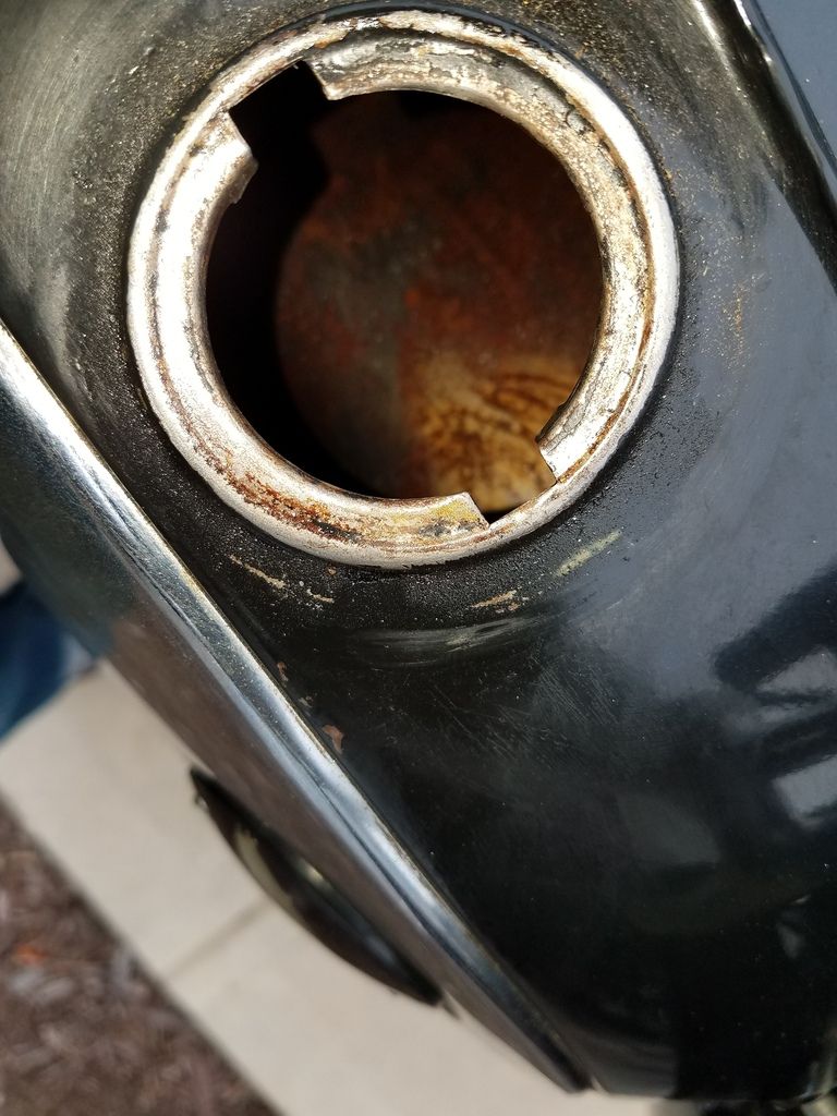 I got a good bit of work done between last night and today. The gas tank had some surface rust in it and a PO had lined just the bottom of it with Kreem, over the rust, of course. So I started with aircraft stripper to remove the Kreem. That came out very easily. Then I rinsed it out with water a few times before filling it to the top with white vinegar for a couple days. I dumped that out, rinsed it with water a few times, then denatured alcohol, then acetone, and finally lined it Caswell. I'm very pleased with the results. Now I can send it down to Pete from Pete's Ponies for paint. He already has the rest of the parts.