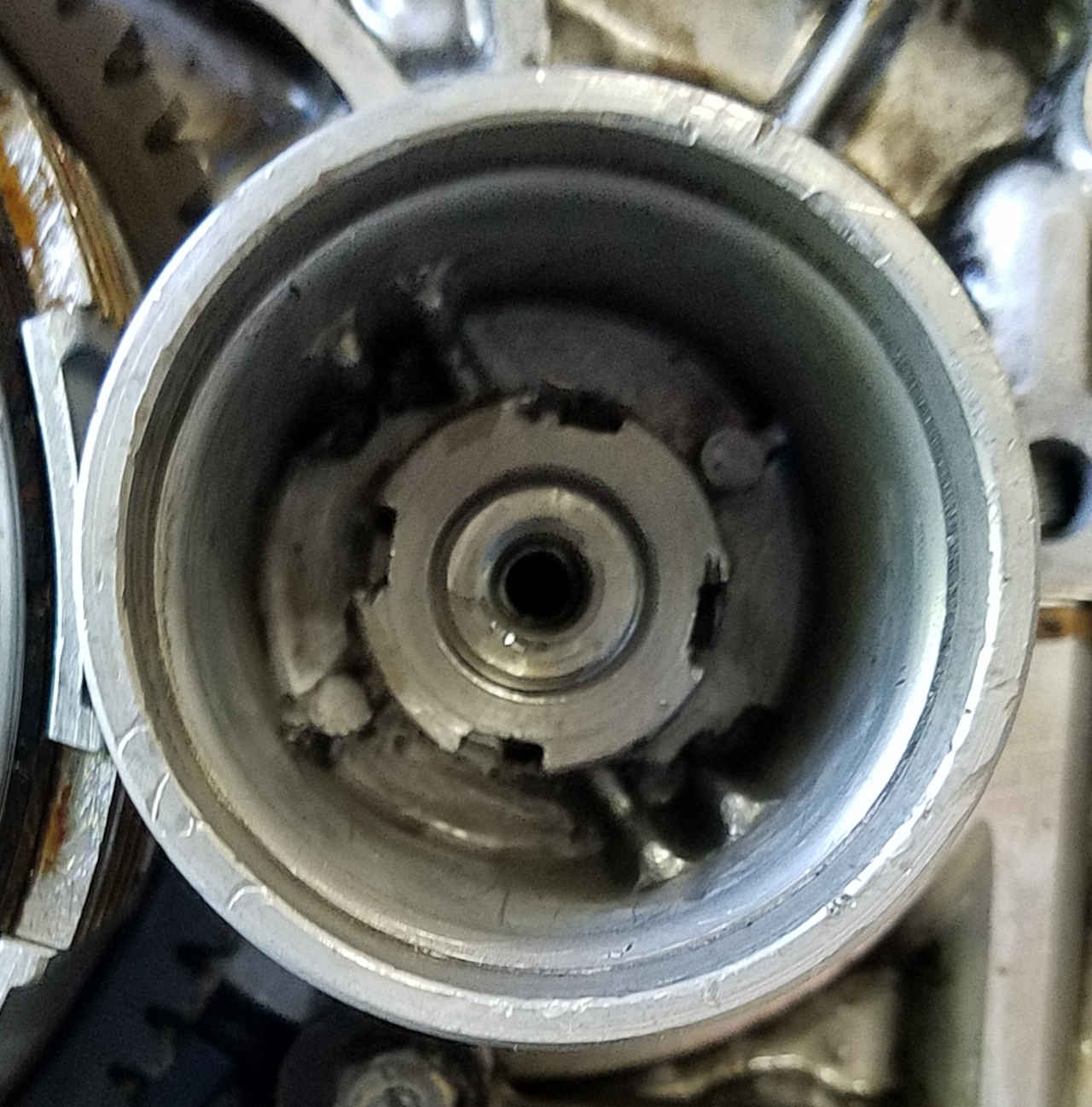 I'm not going to bother stripping the paint off the frame, as it'll get bead blasted once I've welded the rear section on, as the same dumb sh1t who got all artsy with his house paint cut the rear frame section right off, and I had to buy a section off a bery nice Hells Angel who came to my rescue when I needed some parts. Tomorrow I guess I'll turn the bike around and do the other side. Good news is that the engine isn't seized, I pulled the plugs and put it in gear and rolled it back and forth with some WD40 sprayed into each cylinder, and the engine happily turned over, so that's great news.
