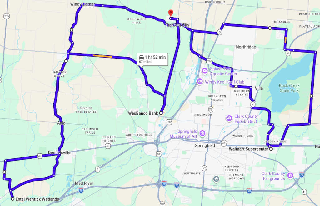 Headed north on SR560 until it dead-ends at SR29.  Took SR29 East to US 36 and then picked up SR 54 South.