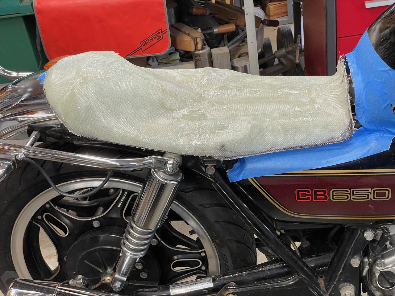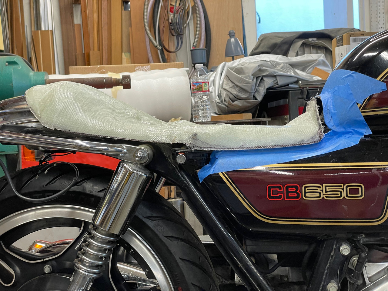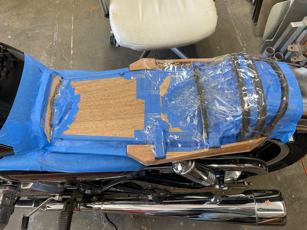 Got back to my seat pan project today. First I tuned up the shape and added a couple wood blocks in the areas of proposed hinge and latch points. Then double-stick taped some 1/4" foam packing material to create sufficient space so the pan would not come into contact with any hard bits to transfer vibration. This foam (I had on hand) has a bit of waviness to it, so does not lay perfectly flat, but I figured this will contribute some additional stiffness to the pan. Next I completed the rough form using packing tape as a mold release. Lastly I masked the bike with poly film to protect the finish.