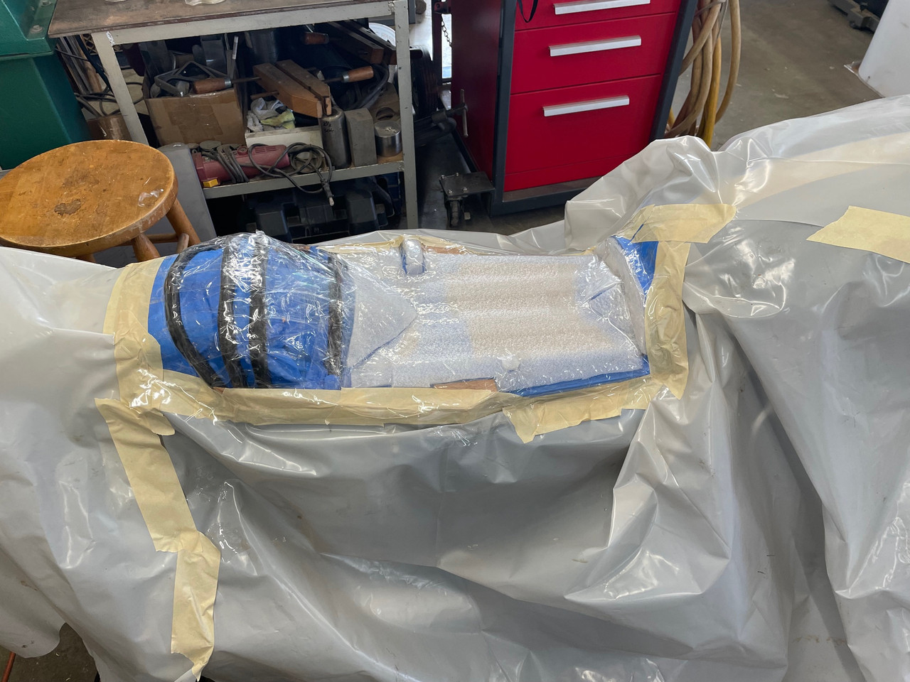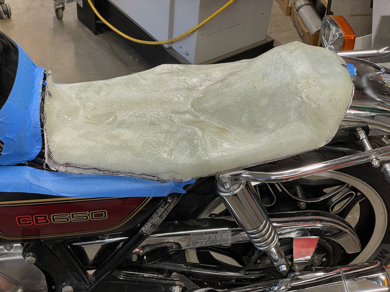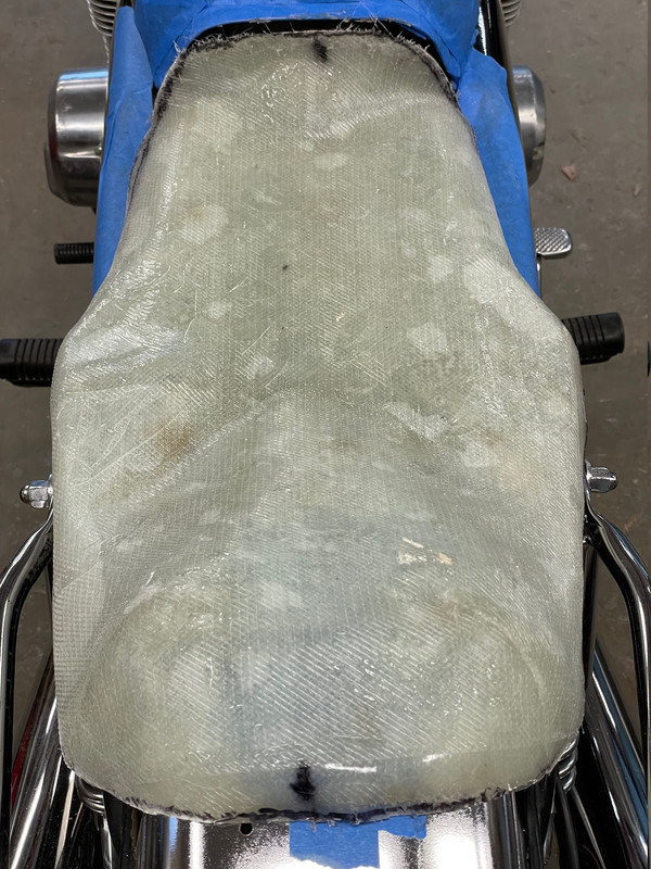Got back to my seat pan project today. First I tuned up the shape and added a couple wood blocks in the areas of proposed hinge and latch points. Then double-stick taped some 1/4" foam packing material to create sufficient space so the pan would not come into contact with any hard bits to transfer vibration. This foam (I had on hand) has a bit of waviness to it, so does not lay perfectly flat, but I figured this will contribute some additional stiffness to the pan. Next I completed the rough form using packing tape as a mold release. Lastly I masked the bike with poly film to protect the finish.