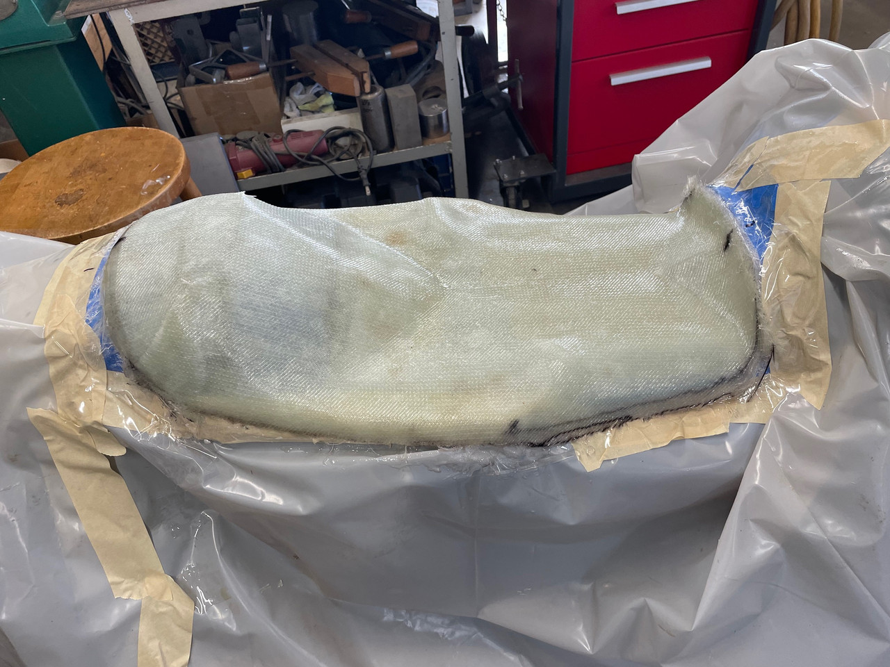 With the prep out of the way I roughed to size, and saturated with epoxy resin, 2 layers of biaxial cloth with matte, and applied both consecutively, without waiting for the first to cure.