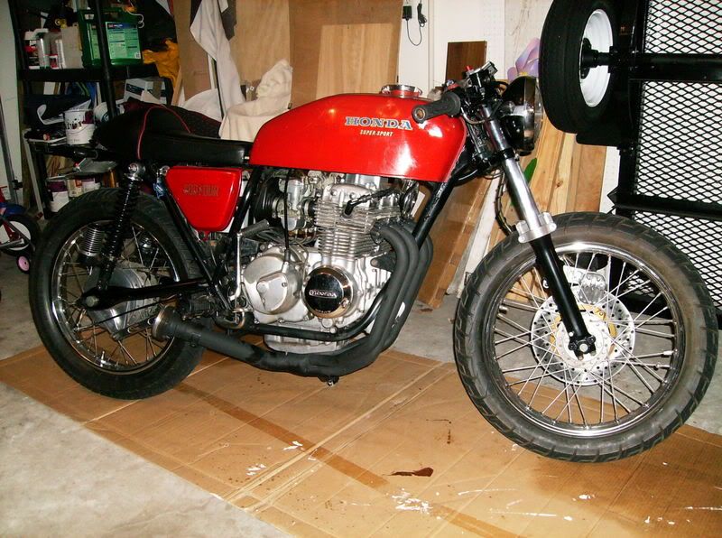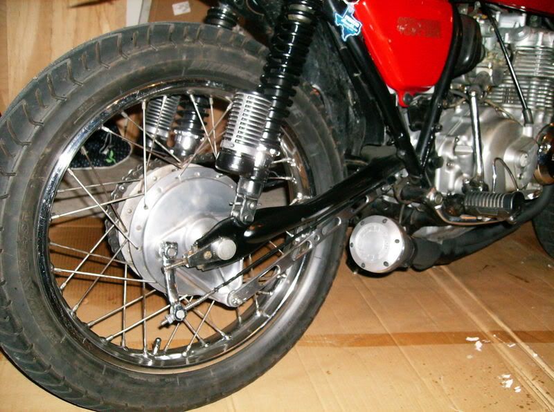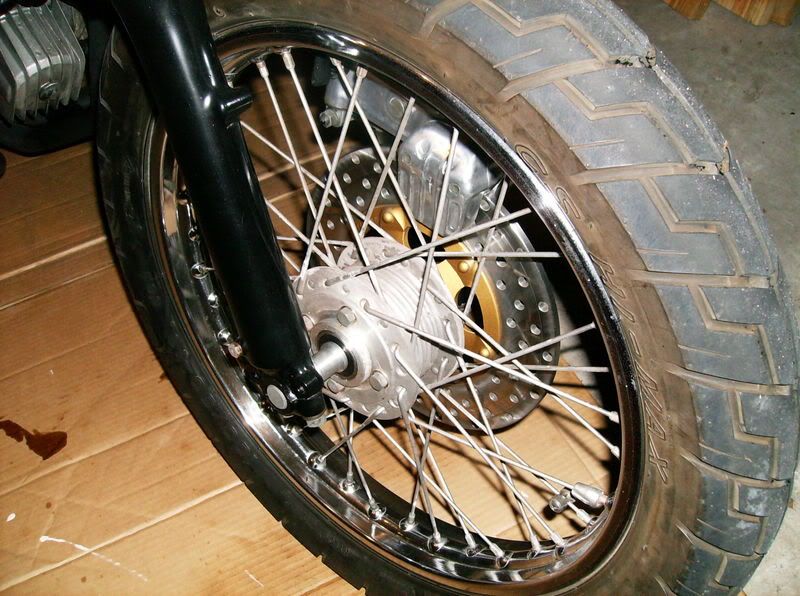 -Lace alloy rims to stock hubs. A custom Buchanan spoke kit is on the way...I've got my fingers crossed on this one because I'm not sure what hub the front rim is drilled for. It was too cheap to pass up though. Judging by it's size, I'm assuming it's for the rear of a 125cc dirt bike with a disk hub and that I can make it work. The rear is a shouldered Akront that was drilled for a drum hub very similar to mine. It was pretty nasty looking, but I re-finished it to look good from 5 feet away. I may regret starting this later, but I really wanted to lighten up the wheels.