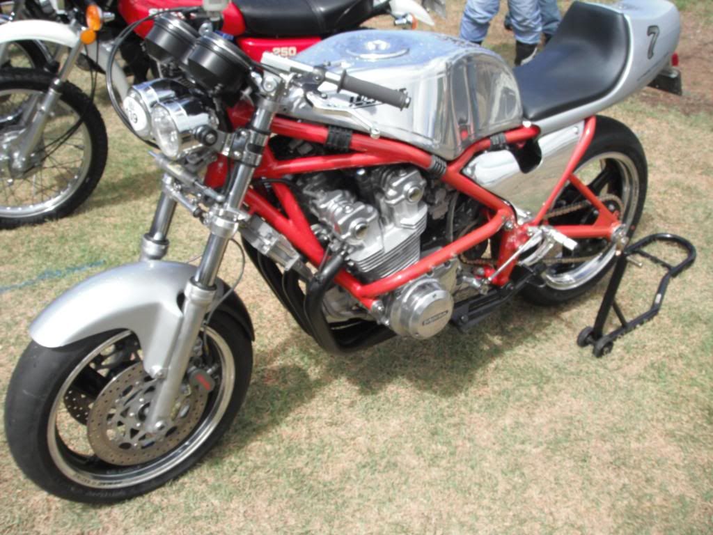 I think its a duc or VFR...rotor. I think if the rotor is bigger..he may have used 750 legs (higher mount pattern) and 500 calipers and hangers (may give more clearance).