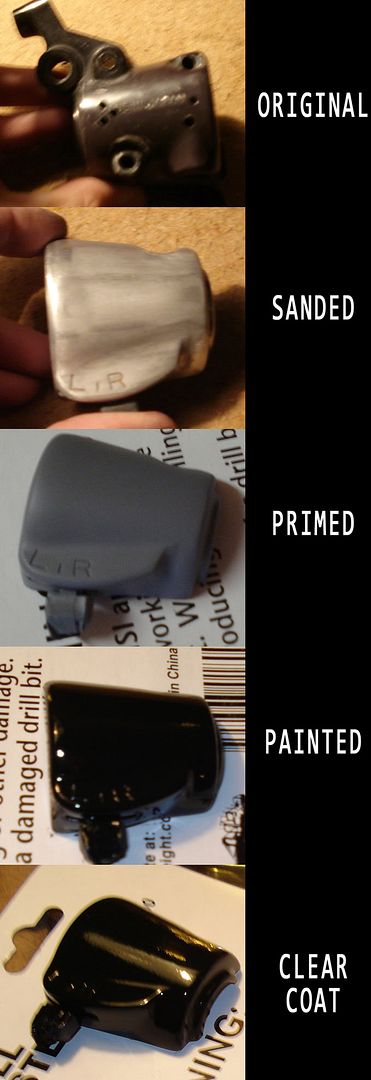 Otherwise your switch will not work anymore. Do the whole disassembling in a bowl. Make pics. Removing the kill switch is tricky but not impossible,...You have to cut the two cables. Be careful, under the kill switch is a very small ball , spring and tin. Then sand your controls and take a good primer. Sand it again (wet) and do your paint job. Do the lettering as BobbyR wrote. BTW, I put some new shrink tube on the cables. Use a magnet to put the kill switch on that it stands up like a mushroom,...easy to paint now.