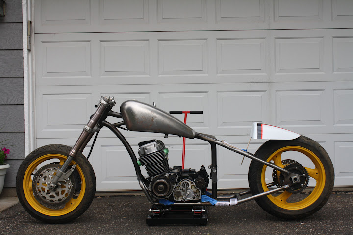 Well, i posted the above questions about a week ago but still have not recieved any answers, so i am going to start my project thread, I bought this 76 750 for $600 bucks, it was in pretty good shape as you can see from the first picture. The only problem with the bike when i got it was that it wanted to jump into gear when idling so since i had to get to the tranny i figured why not rebuild the engine since i am going to have it apart so i decided i will do an 836cc kit cam and some other performance goodies. I found an inspiration picture and dont kill me for it i know it is an evo twin but i really like the look of the bike. Also i posted some pictures of the problem in the tranny below, as you can see the cogs on 1st gear are rounded, i am not sure how that happens but i found a replacement tranny so that is fixed and also i had a local small engine guy who in his prime used to race 750 hondas do a valve job on my head which i believe looks pretty good.