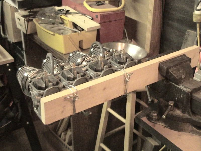 Don't laugh. To get the slow jets out, you do just that.  Though I didn't use tape, I just got a good hold on them with a small pair of Vis-Grips (needle nose type) and gently rocked them from side to side while pulling.  They came out fairly easily with not much damage.  To firmly hold the carbs, while still mounted to the rack, I strapped the carb rack onto a 1x4 and clamped that into my bench vise.