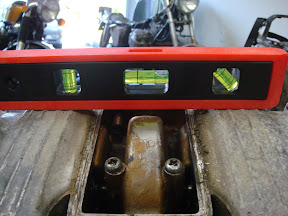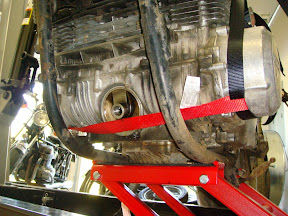 Once the engine is out, its time to get ready to mount it on the stand. Using cam straps makes it very easy to adjust the rig. I throw a level on top and even everything up once its free, just to give me the best chance of getting it mounted smoothly and evenly. And it only takes two seconds.