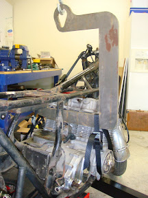 Again, I custom designed the C-hook using a vector graphics program and saved it as a cad file to send to the machine shop. The machinist cut it out while he had another ½” plate job on the jet. When he told me it would be $25.00, I figured he must have liked the idea of doing a favor for a guy who wrenches on vintage bikes. Based on ratings of similar comercially available C-hooks, this hook should lift between 1/2 and 1 ton. Note: I am not an engineer and am not qualified to make that kind of stament