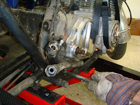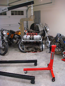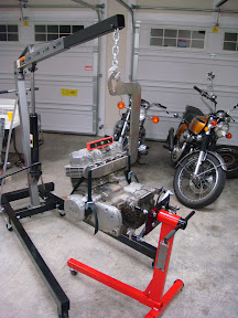 Getting It OutOnce everything is hooked up to your satisfaction, apply tension with the hoist. You’ll see the bike shift a little when the hoist is carrying the engine weight. You should be able to adjust the hoist finely enough to pull the bolts out with a light pull (if the bolts aren’t rusted/frozen/bent/other). Do the rear first, then, when the bolt is out, apply a little more tension and the front should come free. Once the bolts are free and the engine is fully supported by the hoist, tilt the engine forward to clear the engine mounts and then walk the engine out of the frame. It may take a little more tilting and maneuvering, but it’s relatively easy, especially considering your friend isn’t about to loose his grip and drop the whole thing on your toe/bike/side cover/dog.