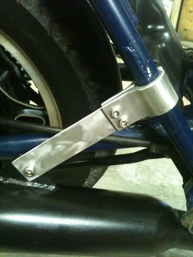 The plate mount I made myself from the same aluminum used for the tach mount. It was very easy. I cut a piece in the shape of a "T" with the top of the "T" the length between the bolt holes for one side of the plate and bent this part up. The leg of the "T" mounts to the bolt that goes through the end of the swingarm to hold the block for tensioning the axle/chain. I just curved the plate by hand.