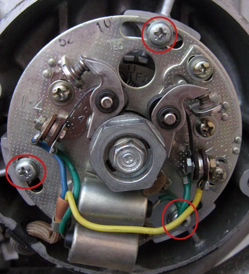 If this is true, then OK, set the gap. The next step for 1.4 is that my understanding is when the 1.4 is at the F tick mark, the points should "just" be opening. If not you loosen the 3 screws on the main plate, shown here: