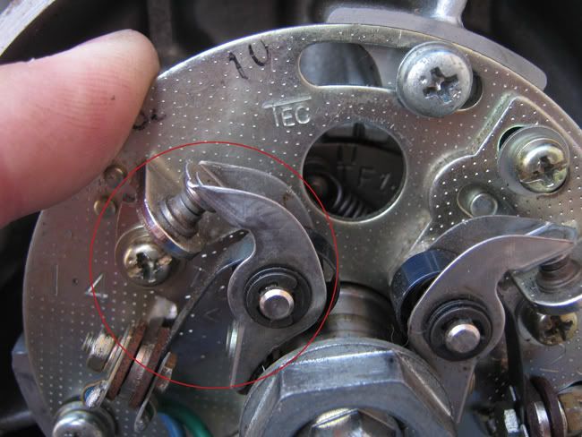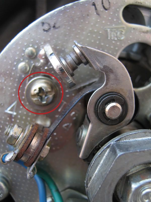 I figure OK, time to make sure the timing is OK. I understand that you rotate the tank, and you wait until the largest gap is in the points and you set that gap. You do that by what I understand is adjusting this singular screw here, correct?: