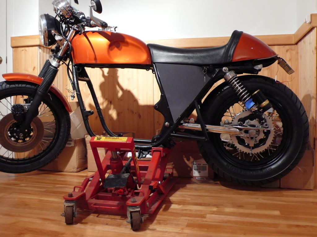 1975 CB750K.  Rear shocks are stock, just cleaned up.  Swingarm is rebuilt and functions as it should.  Front forks have been rebuilt with Progressive springs, new seals and 10w fluid.