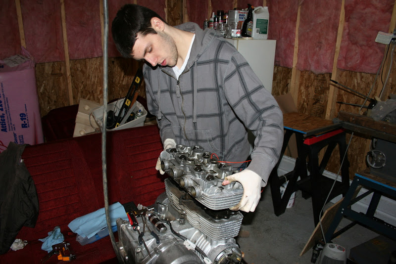 Got the engine in with a bit of struggling, but its in now. We had the carbs installed with the airbox. Got some fuel feeding into the carbs. First thing I noticed was a bit of a leak pouring out of the bottom of one of the bowls, and a big stream from the new fuel line we installed. With a little tightening of the hose clamps, and screws on the carbs, the leaks seem to be gone.