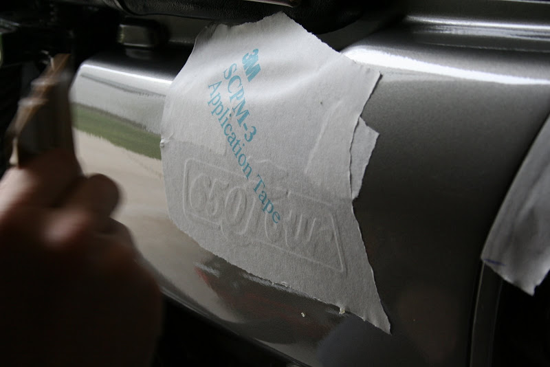 Today Craig came by and we got the decals applied. The process is super simple. First we positioned the vinyl where I wanted it, and taped it in place with some transfer tape.