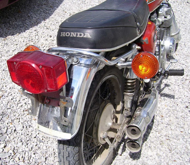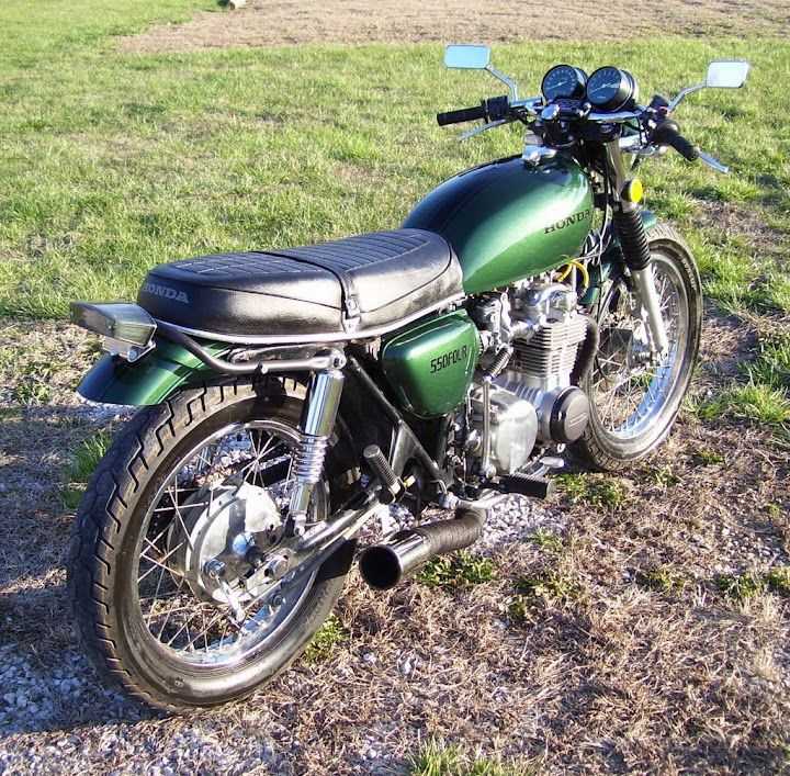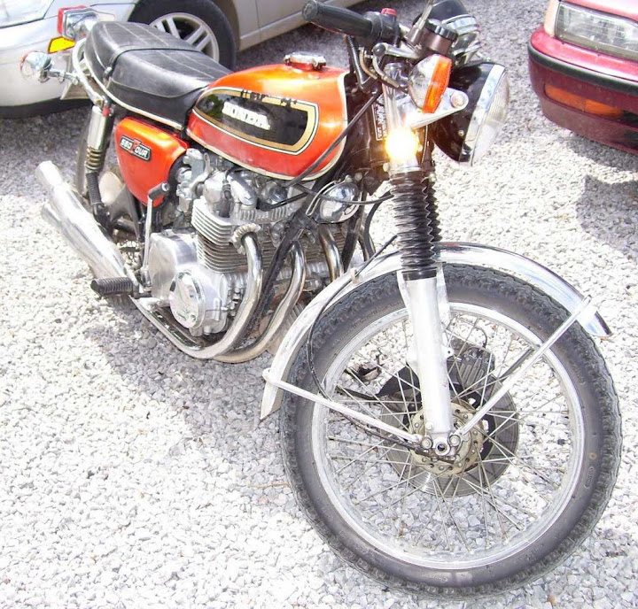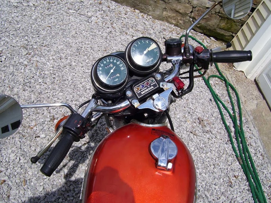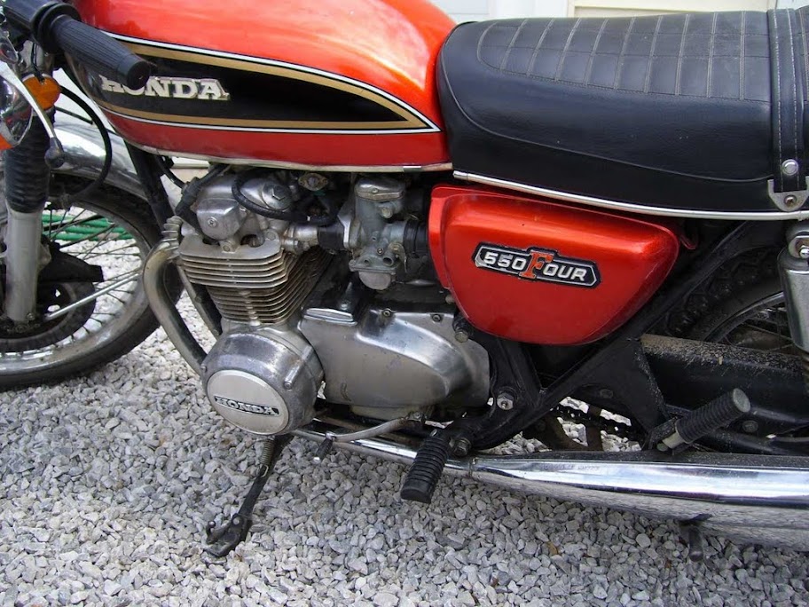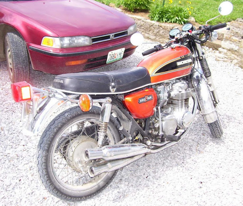 Anyway I picked up this 1975 CB550F in barely running, but rideable condition. I thought it was ugly as sin but I knew it had a lot of potential. It had some electrical problems, the headlight switch was aftermarket and broken, and the starter didn't work. Also it had some ignition problems so cylinder #1 only fired about half the time. It had a few other mechanical problems but most of the trouble was cosmetic. Here are the before shots:
