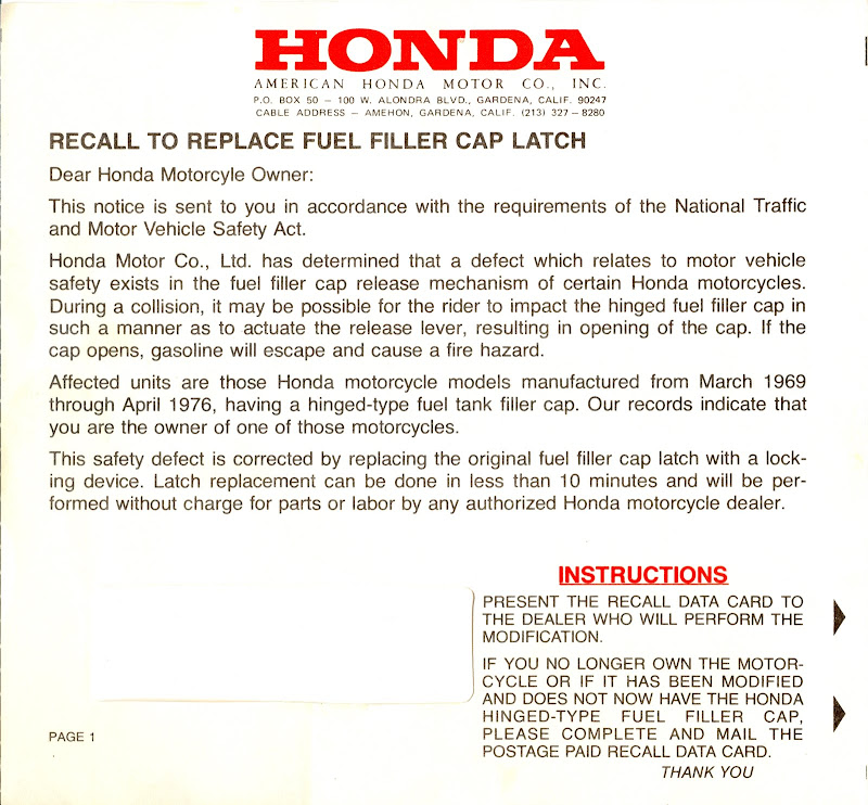 I'm having my cb750K3 serviced at Honda of Glendale, in Glendale, CA. They offered to do the gas cap recall for me, at no charge. My bike's 38 years old!