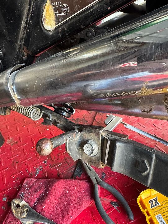 I also got the kickstand back from Caleb. He put a heavy washer on the back so I could match up to the spring stud on the back of the kickstand mount. The spring catches on the kickstand bolt and I don’t see a workaround, so I’m just going to yank the exhaust and put a stud on the front of the mount.