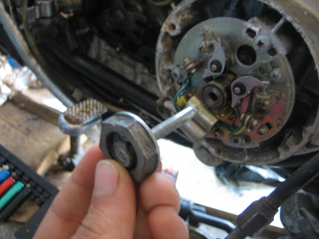 Tried a few different ways to get the crank moving in the beginning, one of them was to reef real hard on the "Special 23mm nut" on the points side ... don't do this.