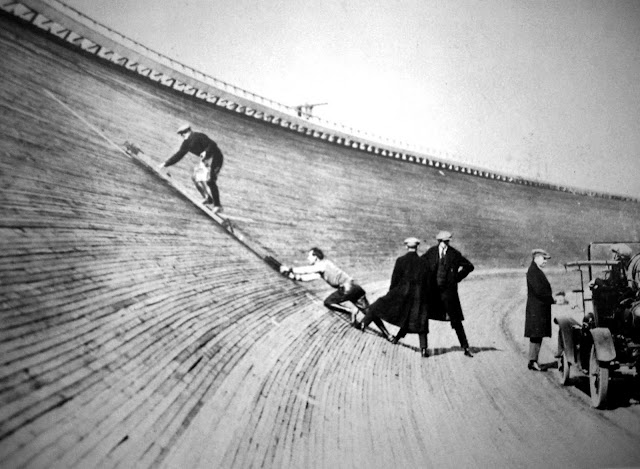 now i have pics to add.QuoteThe banking in the corners of a common board track started at 25° and run upwards of 60°. This allowed the bikes to maintain speeds of around 100mph. Due to these high speeds, and the dangerous nature of these tracks, the fans often referred to them as “Murderdromes”. By 1931 there were 24 operating board tracks, including tracks in Beverly Hills, California, Atlantic City, New Jersey, and Brooklyn, New York.