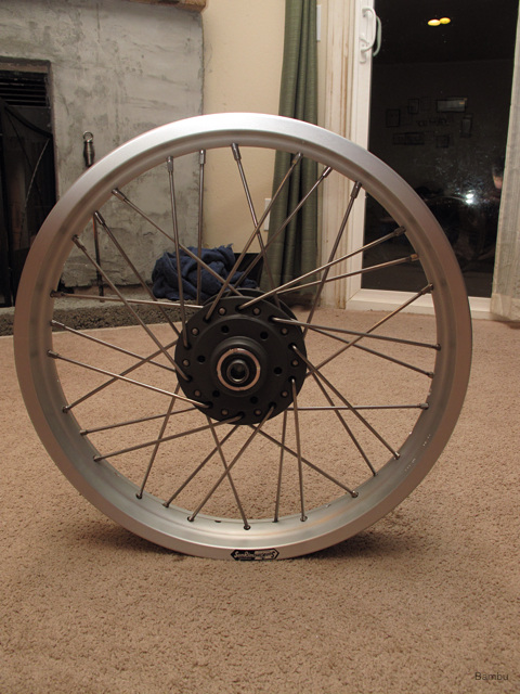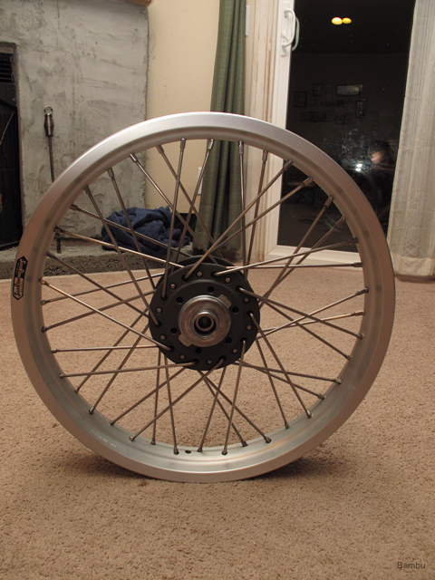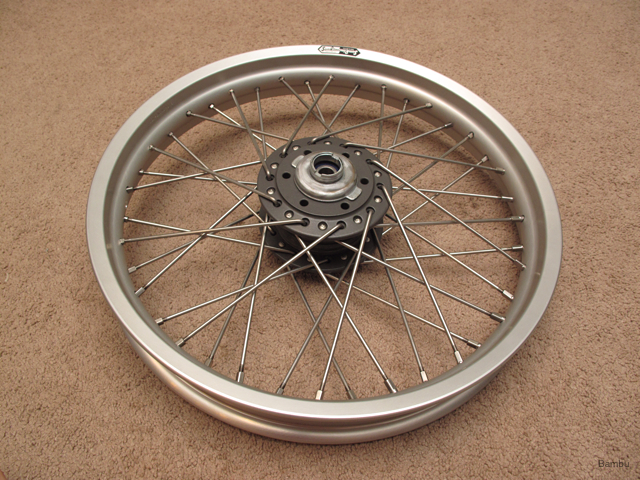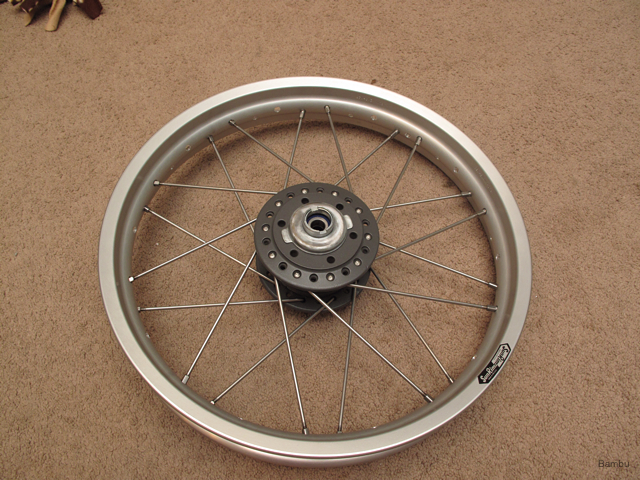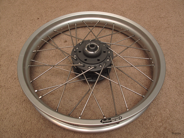So when I got home from the business trip this week I had my new front tire and rim waiting for me! Tire is a Roadrider 100-90/18. Rim is a Sun 2.15 18".