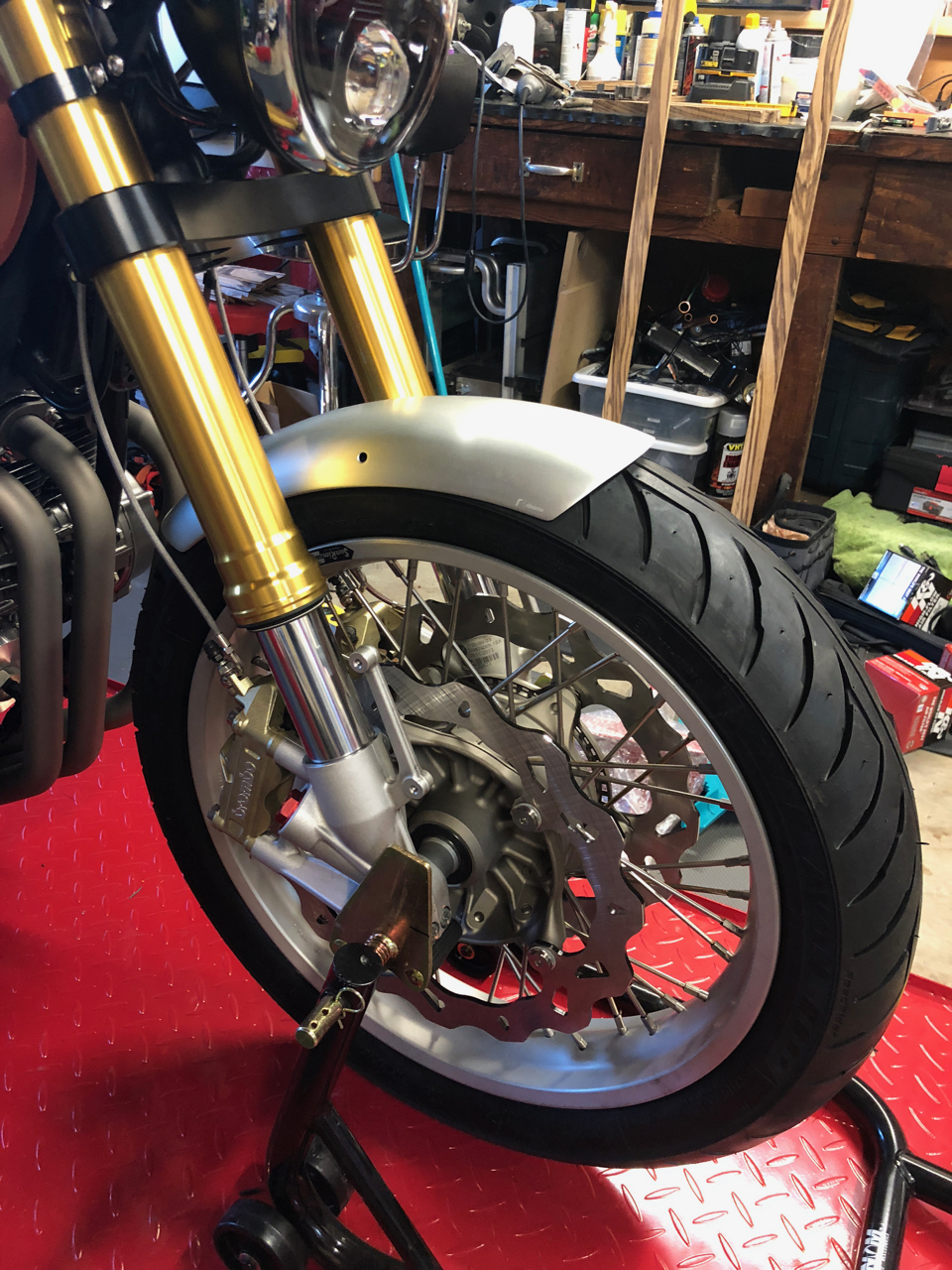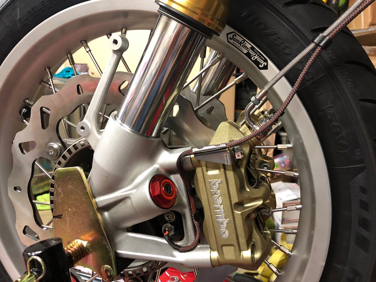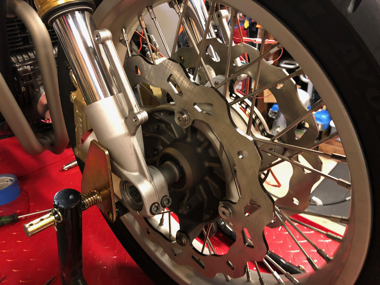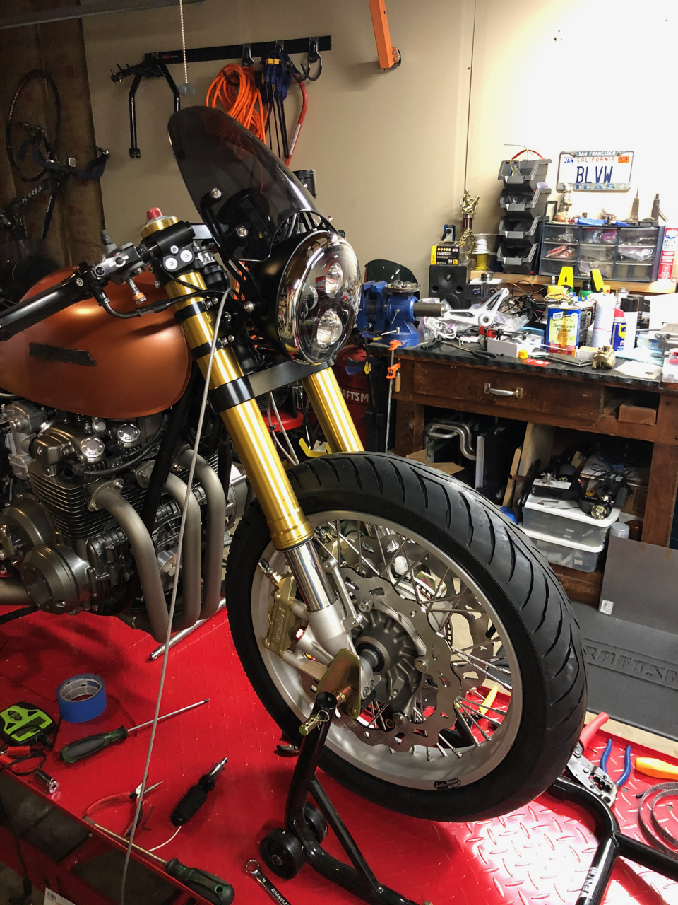 Additionally, I got my lock to lock set so I got the bars in position, clutch line finished, and front brake lines finished. Then I started on the loom down the hump of the frame.
