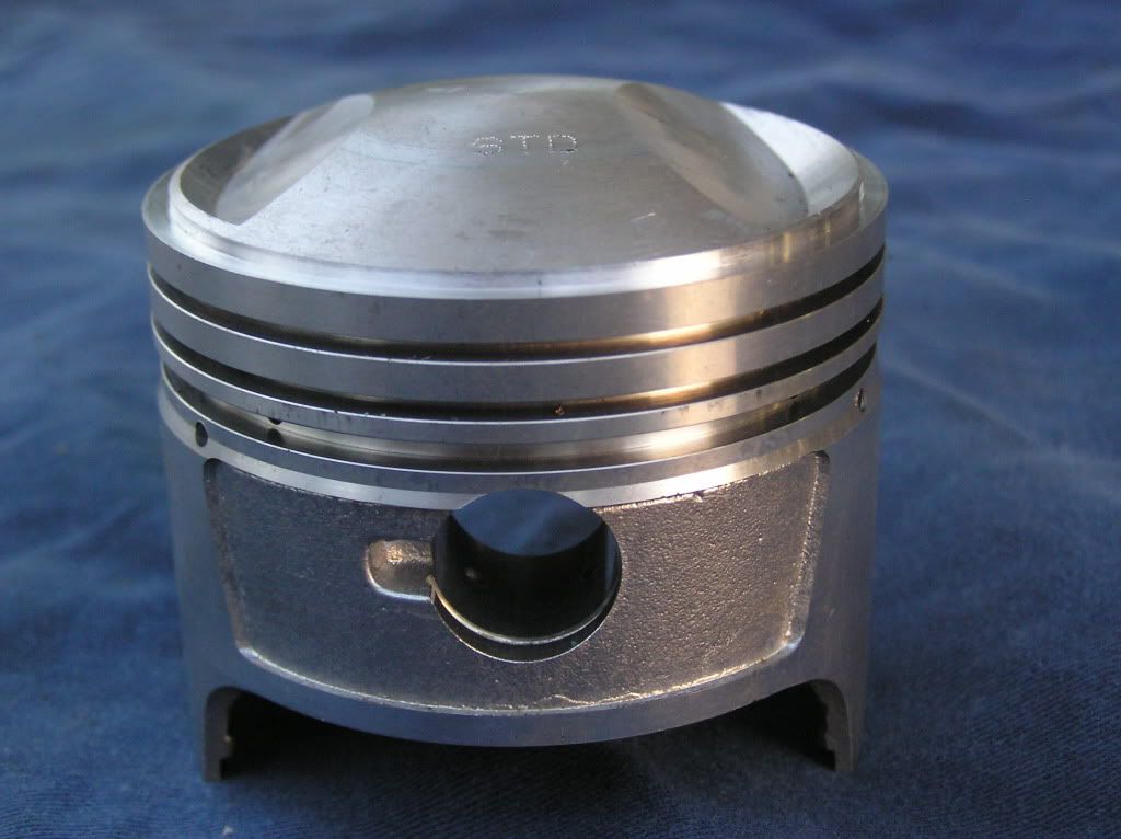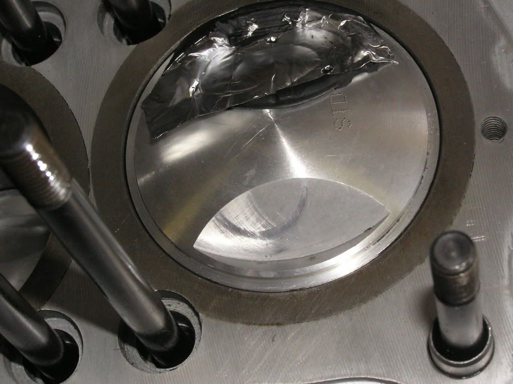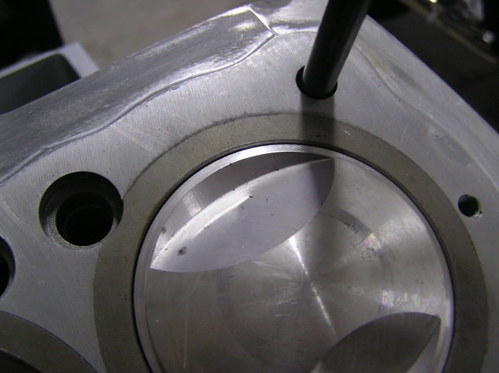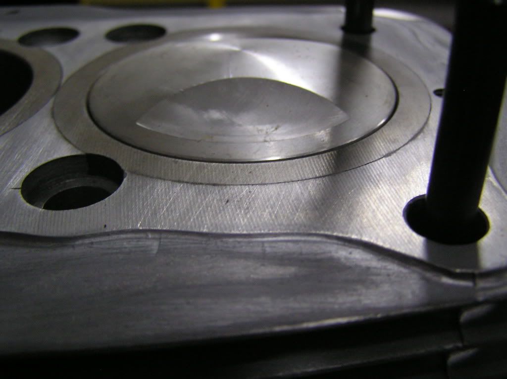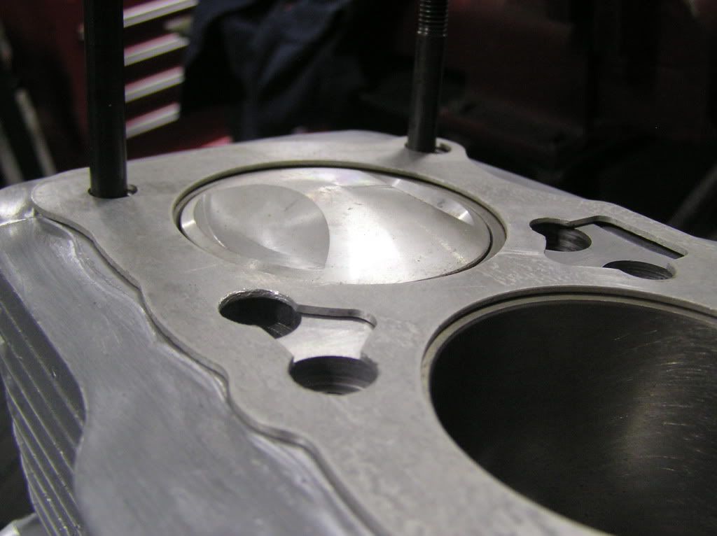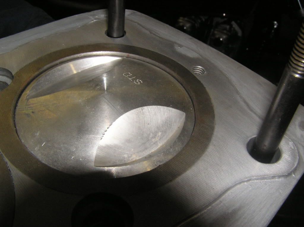 To get the piston dome to fit into the combustion chamber, the edge of the pistons had to be cut in square for clearance. (See earlier pics)