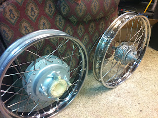 wheels rebuilt with new stainless spokes and rims (wish i had a close up pic of the easy rider chopper wheel it had on the back.. nasty)